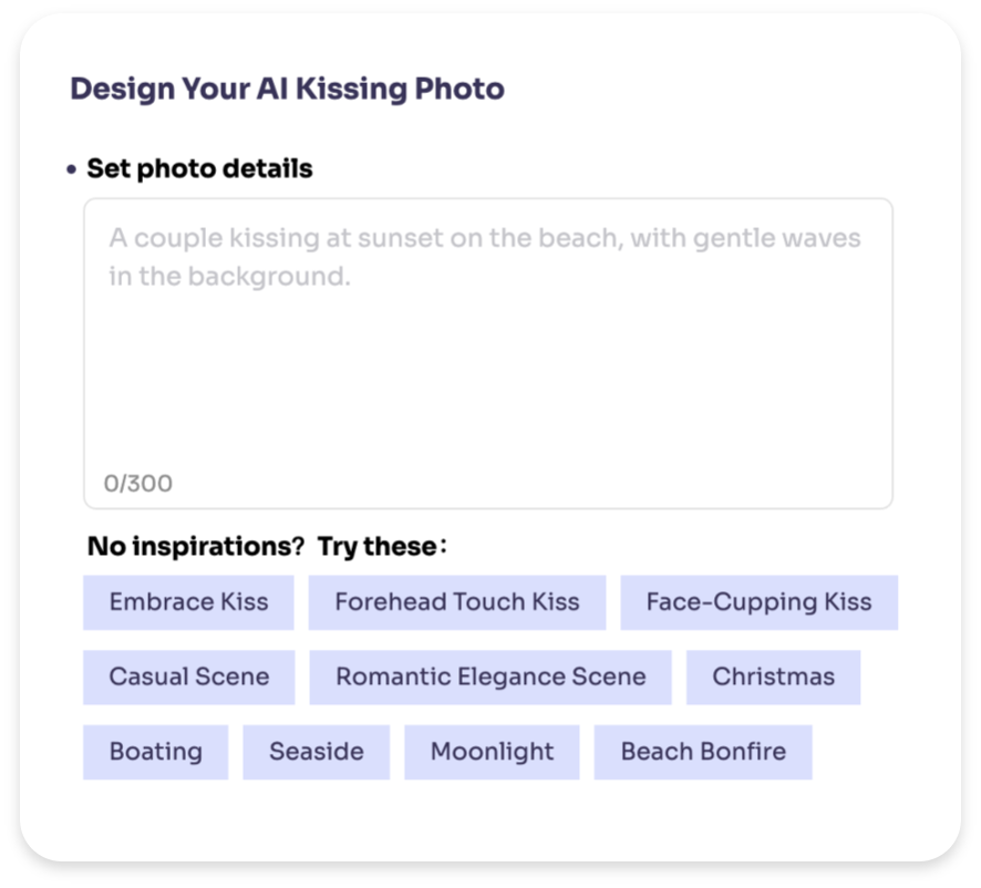 Beginnen Sie, indem Sie Ihr gewünschtes Kussfoto in ein paar Sätzen beschreiben. Je detaillierter Ihre Beschreibung ist, desto realistischer und zufriedenstellender wird das Ergebnis sein.